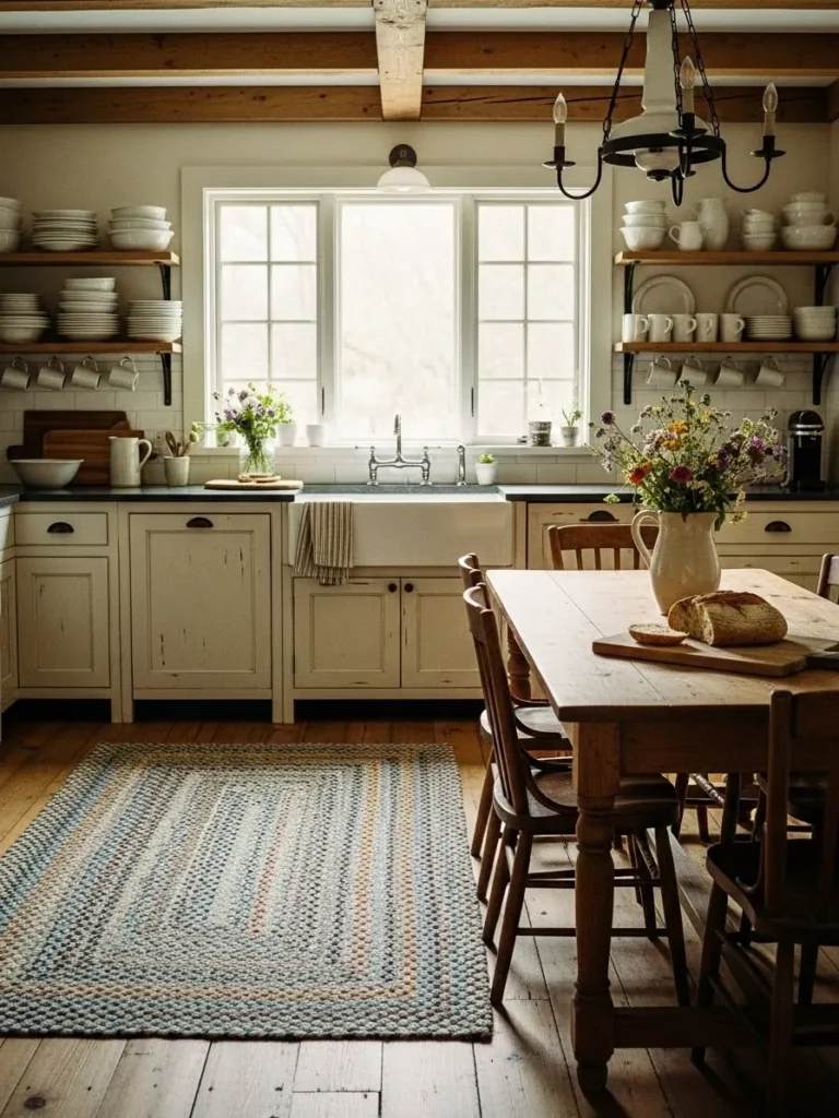 This kitchen has such a warm and settled feeling thanks to its soft palette and collected farmhouse elements. The braided rug instantly draws the eye with its muted blues and earthy tones that blend beautifully with the aged wood floors. Open shelving filled with everyday dishes gives the space an easygoing lived in vibe while the farmhouse sink beneath the big bright window adds that classic country touch. The sturdy wooden dining table, fresh flowers in simple pitchers and exposed beams overhead complete the look with a comforting rustic grace.