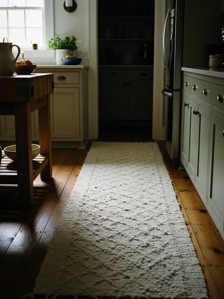 Softly Lit Farmhouse Kitchen With a Cozy Textured Runner