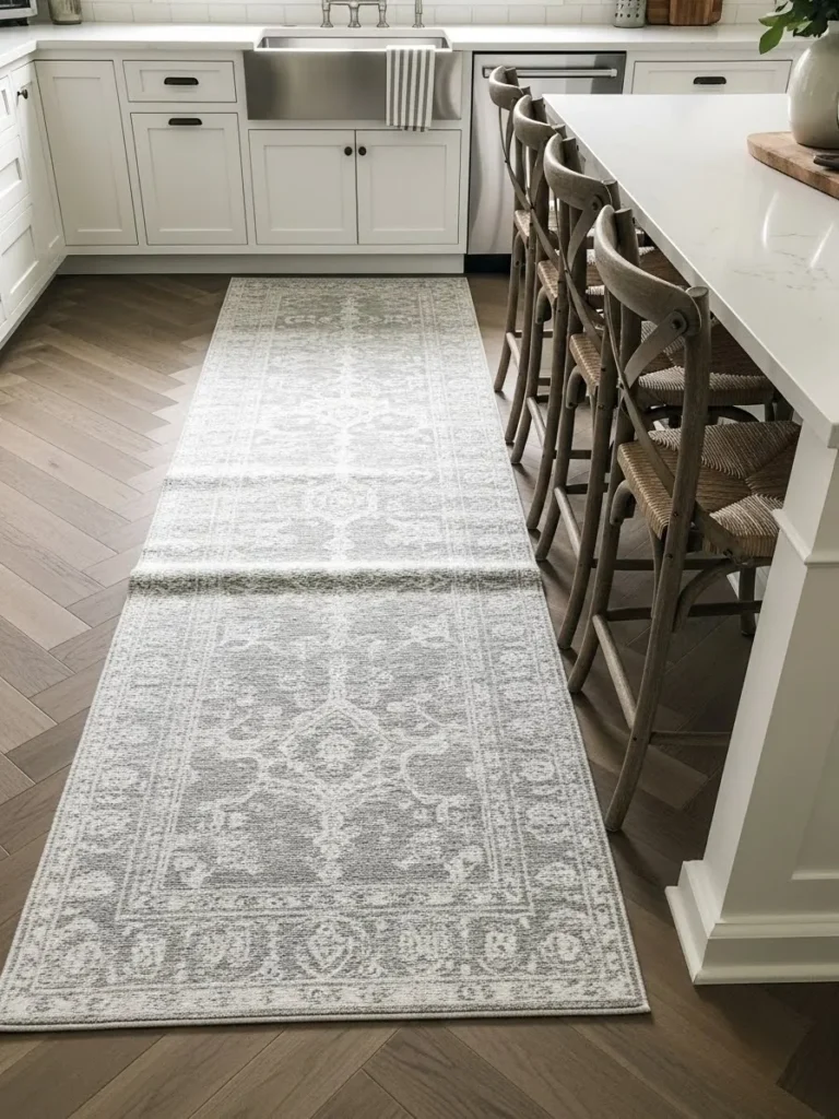 I love how this rug pulls everything together without trying too hard. It feels elegant but still practical enough for a busy kitchen. The muted gray gives just the right amount of contrast against the white cabinets and it makes the entire space feel softer. It is the kind of piece that makes you smile every time you walk across it because it just feels right in the room.