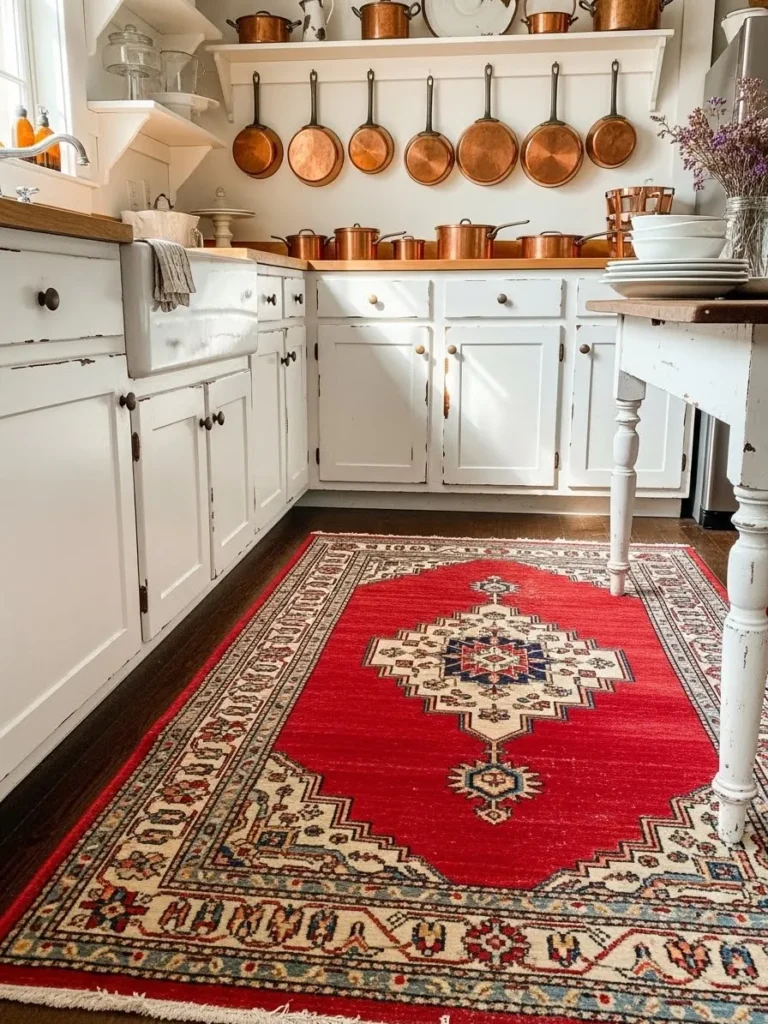 This cozy farmhouse kitchen mixes rustic character with a warm and cheerful palette. The distressed white cabinets and classic apron front sink bring that lived in charm we all adore, while the collection of copper pots adds a gorgeous glow across the room. The real scene stealer is the vibrant red rug with its intricate pattern that instantly energizes the entire space. It anchors the kitchen beautifully and gives the neutral cabinetry and wood tones a fun burst of personality.