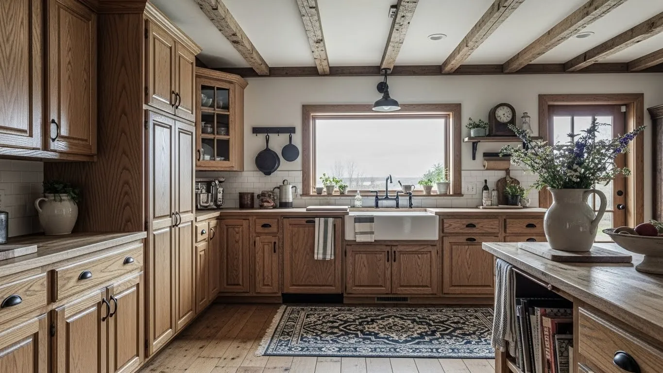 Softly Lit Farmhouse Kitchen With a Cozy Textured Runner