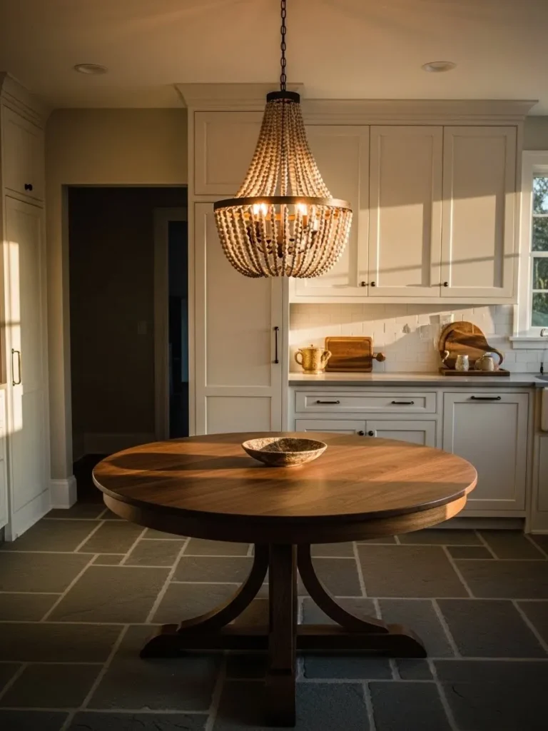 This kitchen feels so peaceful with its soft sunrise light spilling across the round wooden pedestal table. The rich walnut tone keeps the space grounded while the smooth circular shape gives the whole room a gentle flow. The creamy shaker cabinets and simple black hardware pair so well with the beaded chandelier that adds just the right touch of farmhouse charm. I also love how the stone tile floor brings in a hint of rustic texture without overpowering the clean look of the space.