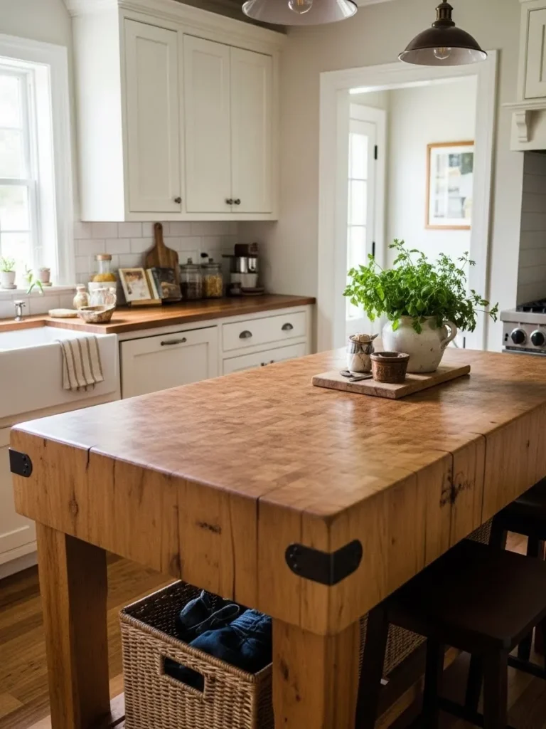 This cozy farmhouse kitchen centers around a chunky wood block table that feels sturdy in the best possible way. The thick butcher block surface has a beautiful checkered pattern that instantly adds warmth to the room. Soft white cabinetry and a classic farmhouse sink keep everything light and airy while the natural wood tones bring in that rustic charm everyone loves. The black hardware accents on the table legs add a subtle hint of contrast that gives the whole space a grounded look. A woven basket tucked underneath offers easy storage and a touch of texture while the fresh greenery on top brings life right into the heart of the kitchen.