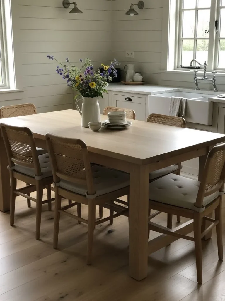 This kitchen brings together that dreamy blend of warmth and simplicity that farmhouse lovers know by heart. The light wood table instantly sets a soft and natural tone in the room, paired with charming woven back chairs that add just a touch of texture. Soft cream walls with subtle horizontal paneling keep everything feeling calm and airy, while the farmhouse sink and vintage style wall lights bring in that classic countryside charm. The simple pitcher filled with wildflowers is the perfect finishing touch that makes the whole space feel lovingly lived in.
