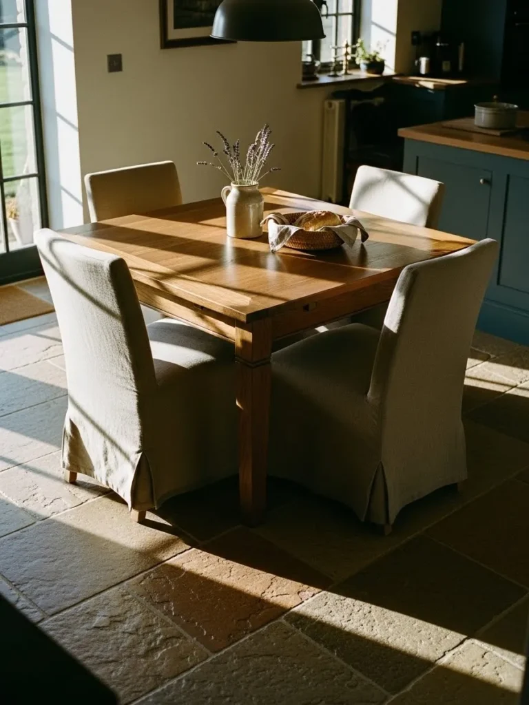 This cozy farmhouse kitchen scene feels like the kind of space that naturally becomes the heart of the home. The square wooden table sits in the prettiest shaft of morning light, giving the whole room a soft golden glow. Upholstered slipcovered chairs add that relaxed countryside charm while still looking polished and inviting. The stone tile floor brings a grounded, rustic touch, and the simple vase of lavender plus the fresh loaf of bread make the table feel warm and lived in. With sunlight pouring in through the tall windows, the whole space feels peaceful and effortlessly welcoming.