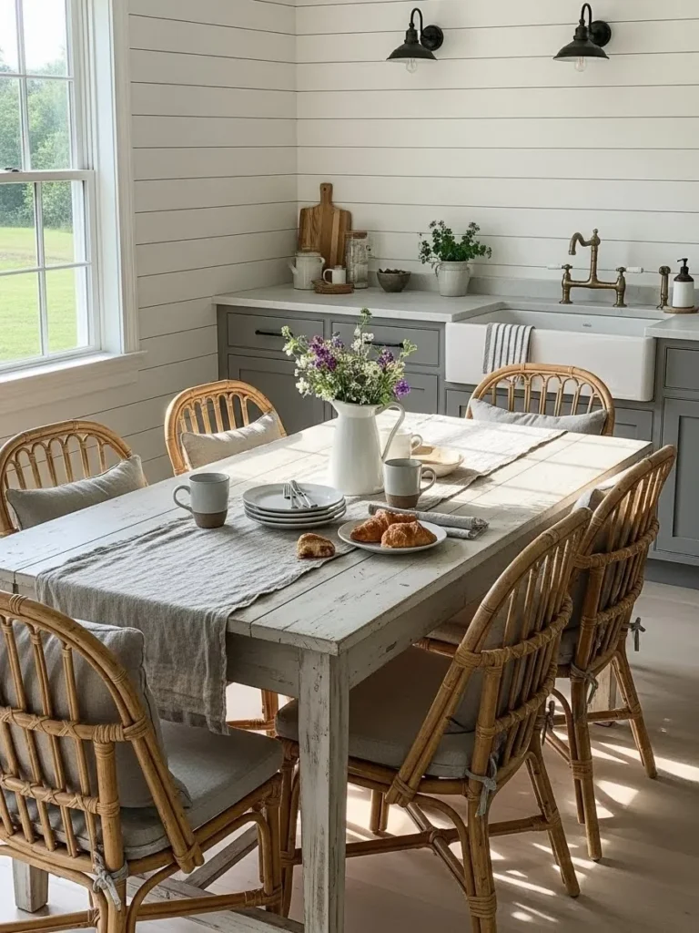 This kitchen has such an easygoing farmhouse charm that feels instantly welcoming. The distressed white table anchors the room with its soft rustic texture, and the natural rattan chairs add a breezy warmth that lightens the whole space. I love how the linen runner keeps everything casual, while the simple place settings and fresh croissants make the table feel like it’s always ready for slow mornings. The gray cabinetry, brass fixtures, and apron front sink pull in that classic farmhouse personality, and the shiplap walls brighten the entire room with a clean cottage feel. With sunlight pouring in through the large window, the whole space feels airy, calm, and comfortably lived in.