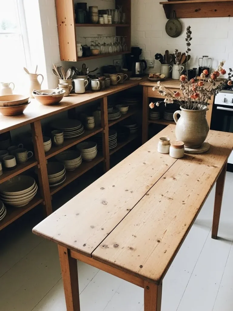 This charming kitchen feels like the heart of a countryside home with its simple wooden table taking center stage. The warm honey tones of the wood blend beautifully with the open shelving filled with pottery pieces, handmade mugs, and stacks of rustic dinnerware. Natural light pours in from the window and highlights every lovely detail, from the dried florals in the ceramic jug to the cozy collection of everyday essentials along the counters. Everything feels intentionally unpolished in the best way, giving the whole room a gentle lived-in softness that farmhouse lovers absolutely cherish.