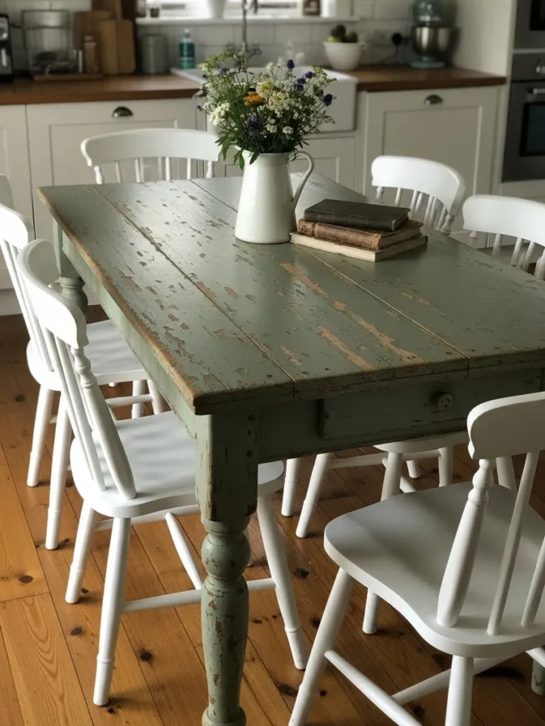 This kitchen scene features the sweetest vintage farmhouse table with a soft sage green finish that’s beautifully weathered in all the right places. The turned legs add that old fashioned character everyone secretly adores and the chippy paint makes it feel like a piece with a story. Paired with crisp white spindle back chairs and warm honey toned wood floors, the whole space feels airy and welcoming. A simple pitcher filled with wildflowers and a small stack of old books sit right in the center which adds a gentle, lived in touch that makes the room feel instantly cozy.