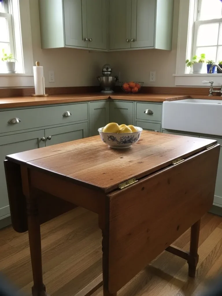 Antique Drop Leaf Charm in a Soft Green Farmhouse Kitchen