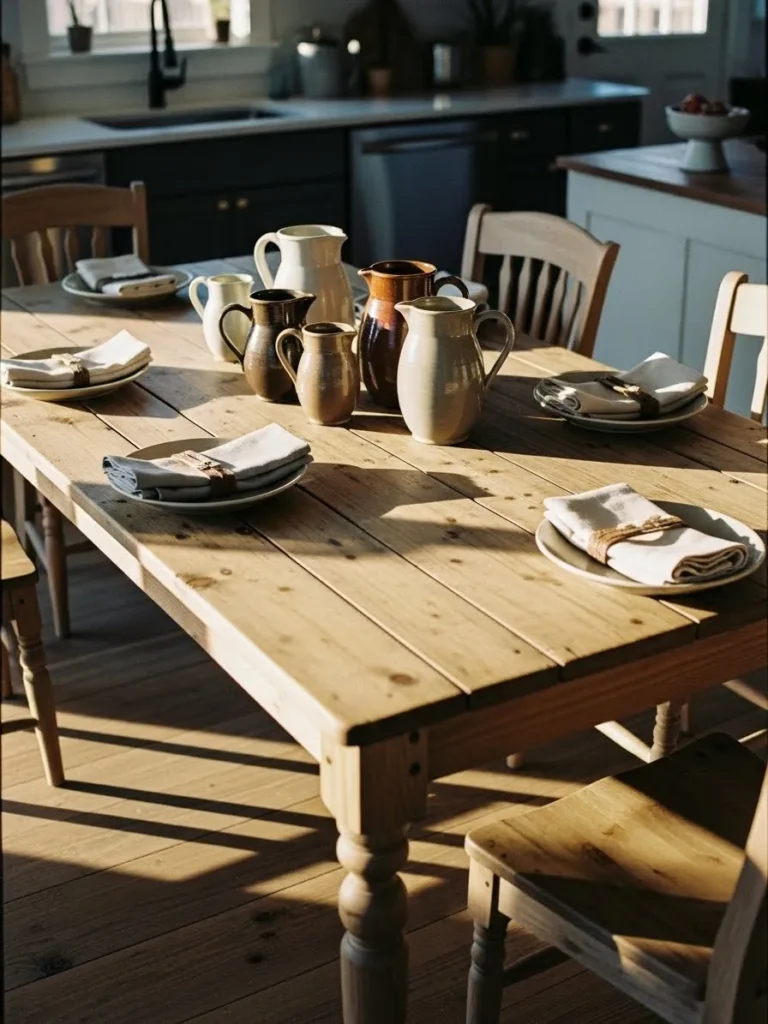 This farmhouse kitchen brings all the cozy charm with a sunlit wooden table that feels beautifully worn in the best possible way. The pale natural finish keeps the room bright while the chunky turned legs give it that classic country personality everyone secretly loves. Simple ceramic pitchers in warm earthy tones create an effortless centerpiece that looks like it came together without trying. Soft napkins wrapped neatly on each plate add a sweet little touch that makes the whole space feel ready for a slow breakfast or an afternoon chat. The surrounding cabinetry in deeper tones balances the lighter wood perfectly and gives the room a grounded feeling without taking away its warmth.