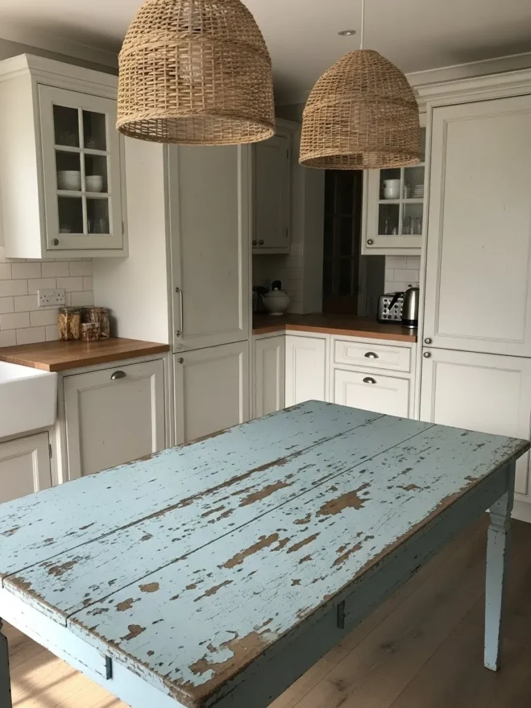 This farmhouse kitchen leans into that sweet spot between pretty and practical with a beautifully worn blue table that steals the scene without even trying. The soft sky blue paint is charmingly distressed which adds instant character and gives the whole room a lived in, loved in feel. Paired with warm butcher block countertops crisp white cabinetry and those oversized woven pendant lights the space feels airy relaxed and wonderfully imperfect in the best possible way. The table becomes the anchor of the room pulling together all the cozy textures and subtle colors that make farmhouse style feel so inviting.