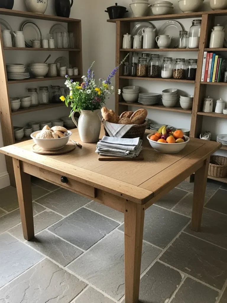 This farmhouse kitchen has such an inviting charm with its natural wood table taking center stage. The light oak tone feels warm and lived in and the single drawer adds a sweet little old world detail that makes the whole space feel even more authentic. The open shelving in the background is filled with stacked white dishes, glass jars, and pretty ceramics that give the kitchen a cozy pantry style look. The stone tile floor brings in that classic farmhouse texture that instantly grounds the room. A vase of fresh wildflowers and bowls filled with fruit and bread make the table feel like it is always ready for a slow morning or an afternoon snack with someone you love.