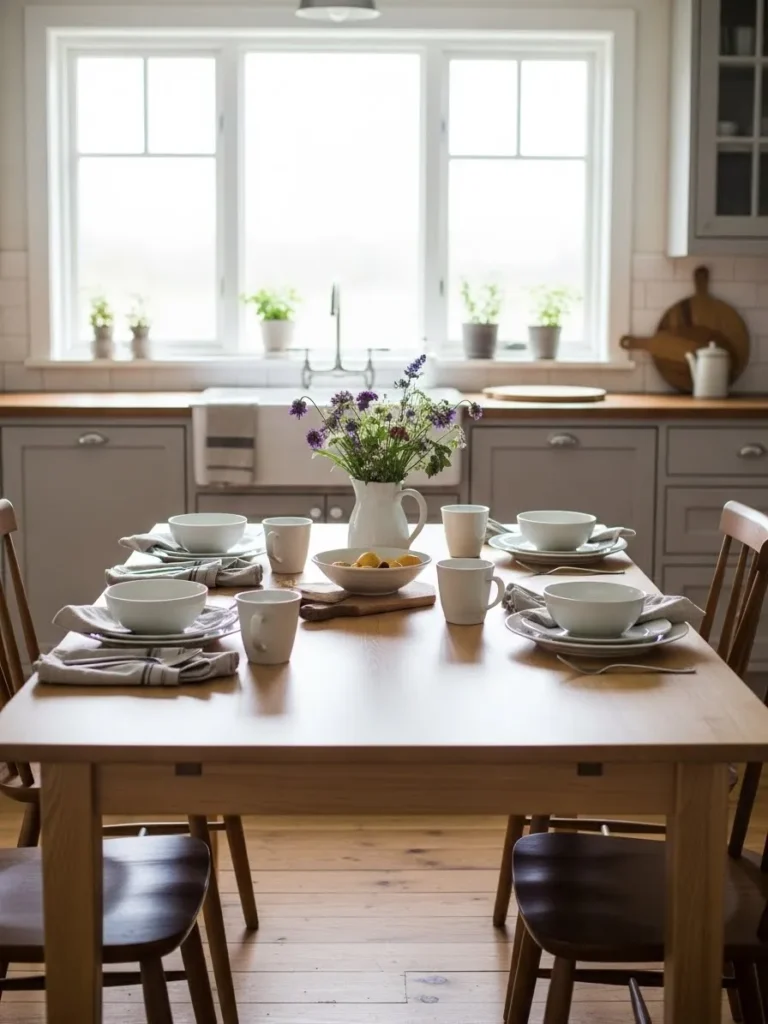 This charming farmhouse kitchen features a clean and airy look with a simple wooden table taking center stage. The natural wood grain brings warmth to the room and pairs beautifully with the soft gray cabinetry in the background. The table is styled with classic white dishes and neutral napkins that feel relaxed yet thoughtfully arranged. A small pitcher of fresh flowers adds a cheerful touch and pulls in just enough color to make the whole scene feel alive. Sunlight pours in through the wide farmhouse style windows which brightens every corner and highlights the cozy textures of the space.