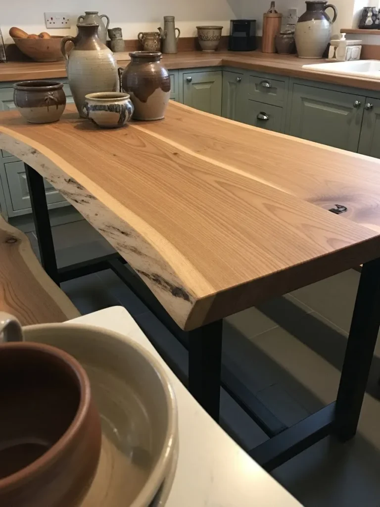 This kitchen features a stunning live edge farmhouse table that instantly becomes the heart of the room. The natural wood grain brings an earthy warmth that pairs beautifully with the soft sage cabinetry in the background. I love how the table keeps its organic edge since it adds personality without feeling too fussy. The simple black metal base grounds the piece and gives it that subtle modern farmhouse balance. The collection of handcrafted pottery on top adds texture and charm which makes the whole space feel curated yet relaxed.