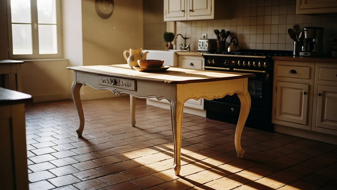 Warm Wood Table in a Sunlit Farmhouse Kitchen