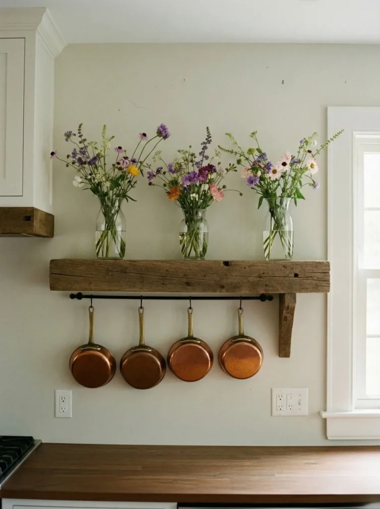This farmhouse kitchen wall idea brings together the sweetest mix of rustic texture and fresh floral beauty. The reclaimed wood shelf instantly sets a warm and cozy tone with its weathered edges and sturdy bracket supports. Below it hangs a simple black rod with four copper pans that shine like little pieces of kitchen jewelry. The three glass vases filled with wildflowers add a soft touch that feels relaxed and effortless. It is the kind of wall decor that feels both practical and pretty which is exactly what makes farmhouse style so inviting.