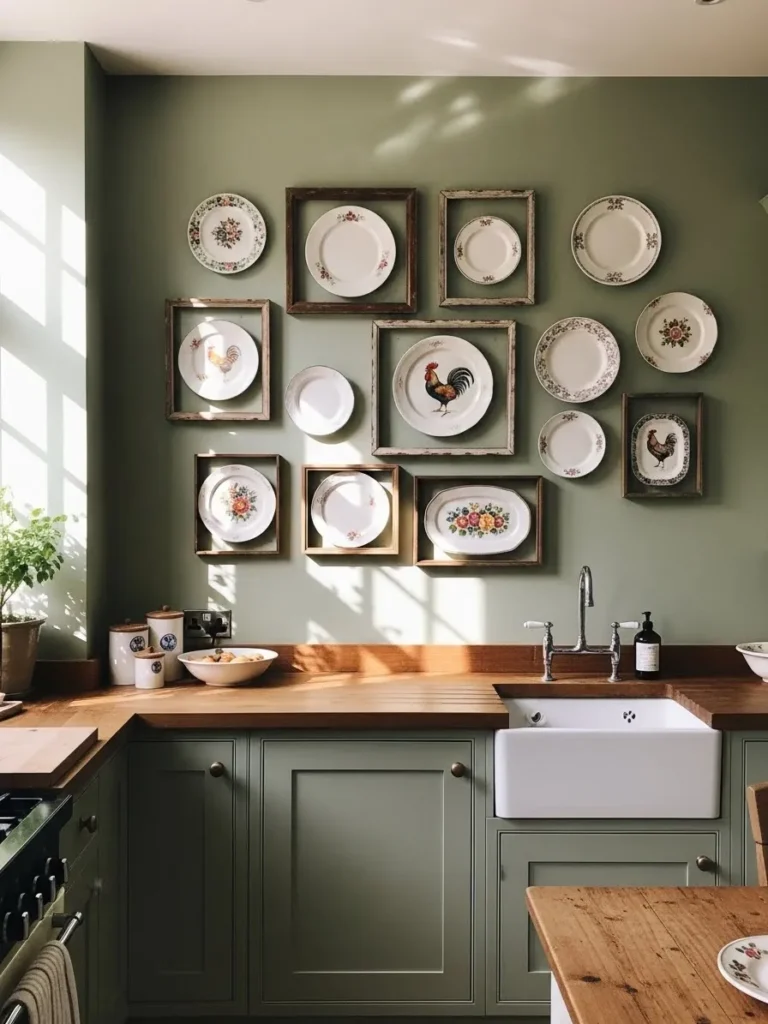 This farmhouse kitchen feels instantly charming thanks to a gallery wall of vintage plates arranged in rustic wooden frames. The soft sage green walls set the perfect backdrop for the mix of floral patterns and bold rooster motifs. Warm wood countertops and matching cabinetry pull the whole look together while sunlight moves across the space in the prettiest way. The setup feels thoughtful but still relaxed which makes the wall art stand out without feeling fussy.