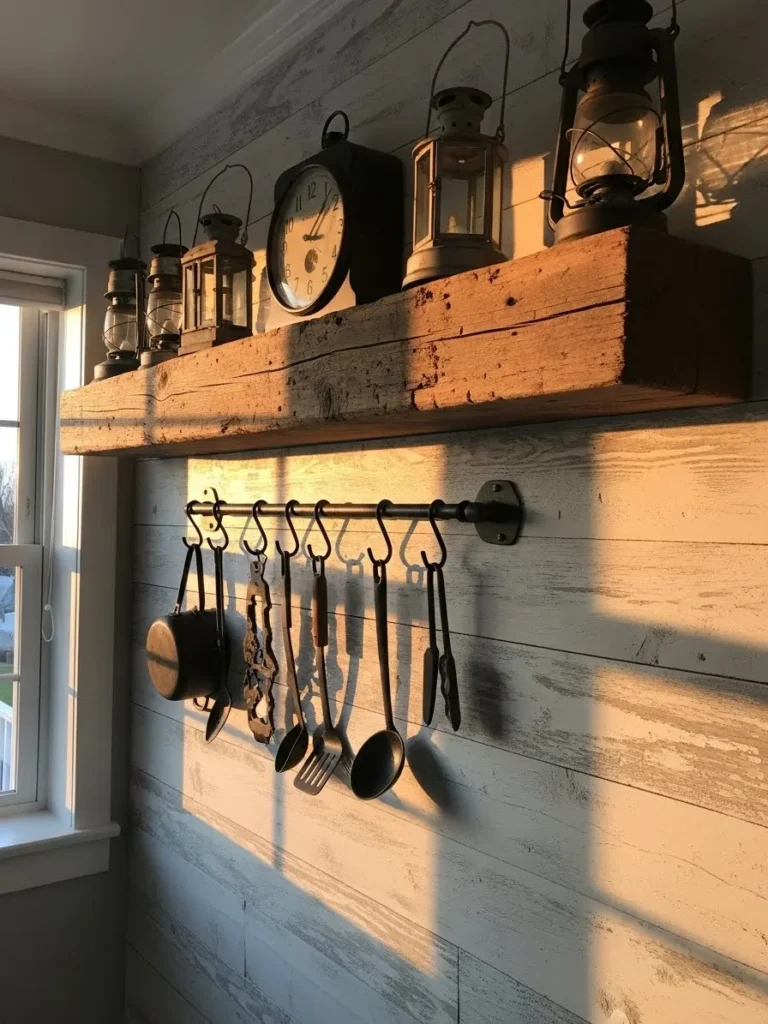 This farmhouse kitchen wall idea brings so much character with its chunky reclaimed wood shelf paired with a row of old lanterns that look like they were collected on sweet weekend treasure hunts. The warm evening light highlights every knot and grain in the wood which makes the whole wall feel even cozier. Below the shelf hangs a simple black metal rail with well loved utensils that add both function and personality. The soft weathered look of the white plank wall ties everything together and gives the entire space that timeless countryside warmth everyone loves.