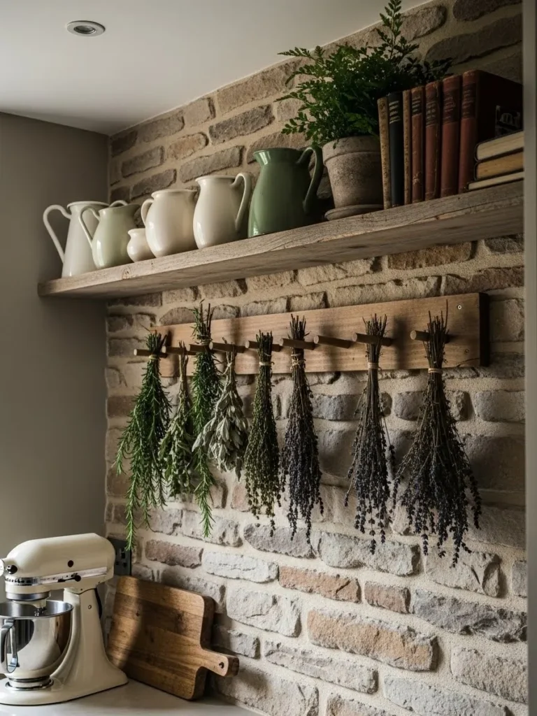 This farmhouse kitchen wall decor brings together the coziest elements of country living. A warm brick backsplash sets the tone with its soft earthy texture, and the wooden peg rail adds a practical touch that feels straight out of an old countryside cottage. Bundles of rosemary, lavender, and sage hang in neat little rows that look both beautiful and purposeful. Up above, a sturdy wooden shelf holds a sweet assortment of ceramic pitchers in creamy whites and soft greens, along with worn vintage books and a leafy plant that adds a gentle pop of life. Every piece works together in a way that feels collected over time and full of quiet charm.