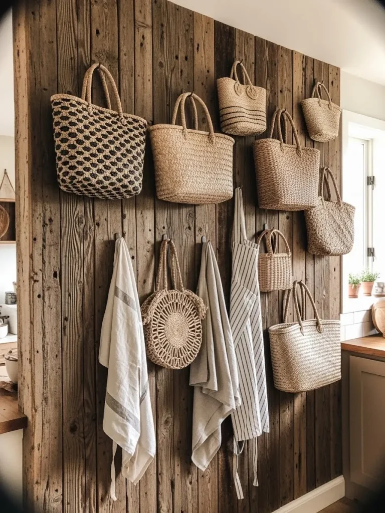 This charming kitchen wall idea turns simple woven market bags into the prettiest functional artwork. The rustic wood plank wall sets the warm and cozy tone, and the mix of straw totes, textured wicker designs and soft striped linens adds a lovely blend of pattern and natural fibers. Each hook holds something different which makes the whole display feel collected and personal rather than staged. The soft neutral palette keeps the look calm and airy so it still feels practical for an everyday kitchen.