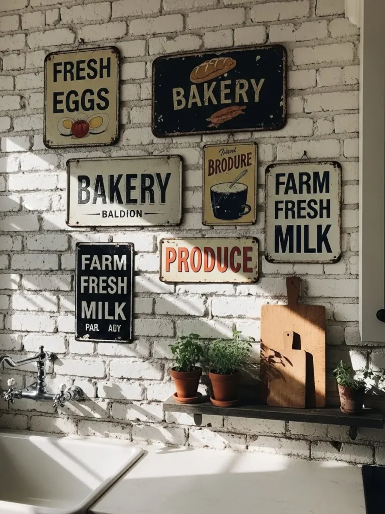 This charming kitchen wall setup brings together a mix of vintage market style signs that instantly warm up the space. The distressed metal pieces with phrases like fresh eggs bakery and farm fresh milk look so nostalgic against the whitewashed brick wall. Their worn edges and bold lettering create that perfect collected over time vibe that so many farmhouse lovers swoon over. Paired with the tiny potted herbs on a simple wooden shelf and a chunky cutting board leaning casually nearby the whole area feels earthy welcoming and wonderfully lived in.