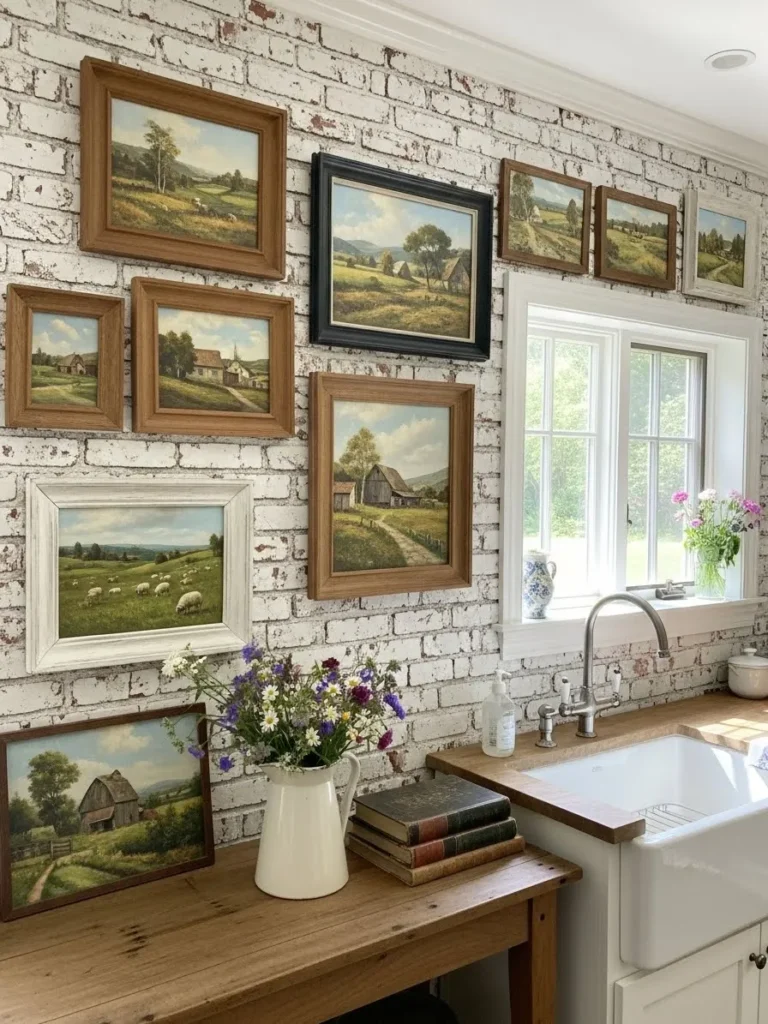 This cozy farmhouse kitchen feels instantly nostalgic thanks to a beautifully collected gallery wall filled with rustic countryside paintings. Each piece brings soft greens, warm browns, and peaceful pastoral scenes to the whitewashed brick wall, creating a look that feels curated over time rather than styled for a single moment. The mix of frame sizes adds a relaxed layered effect that fits perfectly beside the bright window and classic apron front sink. Soft natural light pours across the wood countertop, highlighting the vase of freshly gathered wildflowers and the stack of worn vintage books that complete the room’s storybook charm.