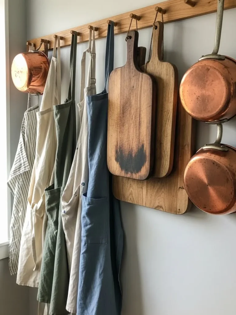 This farmhouse wall decor idea uses a long wooden peg rail to turn everyday essentials into the prettiest display. A mix of soft cotton aprons hangs in relaxed folds while warm wooden cutting boards bring in that rustic texture everyone loves. The copper pots add a gorgeous hint of shine that instantly warms up the space. Everything feels intentionally effortless and wonderfully lived in. It is the kind of setup that makes a kitchen feel loved and well used in the best way.