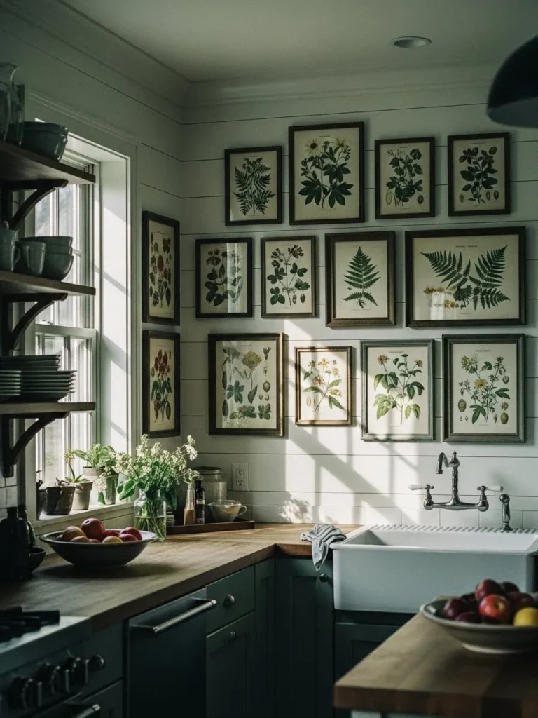 This farmhouse kitchen turns a simple corner into the prettiest little gallery wall with a full collection of vintage botanical prints. The soft shiplap backdrop lets all those delicate leaves and flowers shine while the warm wood countertops and deep green cabinets ground the space with an earthy feel. Sunlight pours in through the window and lands right across the artwork which makes the whole wall look like a curated moment from an old countryside cottage. The classic farmhouse sink and open shelving add to the relaxed rhythm of the room and everything feels collected with care rather than styled in a rush.