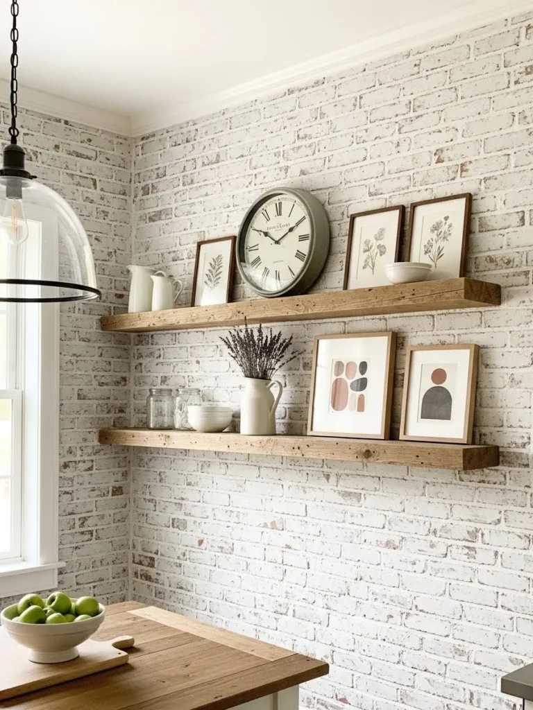 I think this setup is so beautiful because it feels effortless yet thoughtfully styled at the same time. I love how the mix of artwork gives the wall personality without overwhelming it. The rustic shelves keep things grounded while the brick adds just the right amount of texture. Every time I look at this space I imagine how easy it would be to swap pieces around and refresh the vibe with hardly any effort. It is the kind of wall decor that makes a kitchen feel loved and lived in which is always my favorite kind of design.
