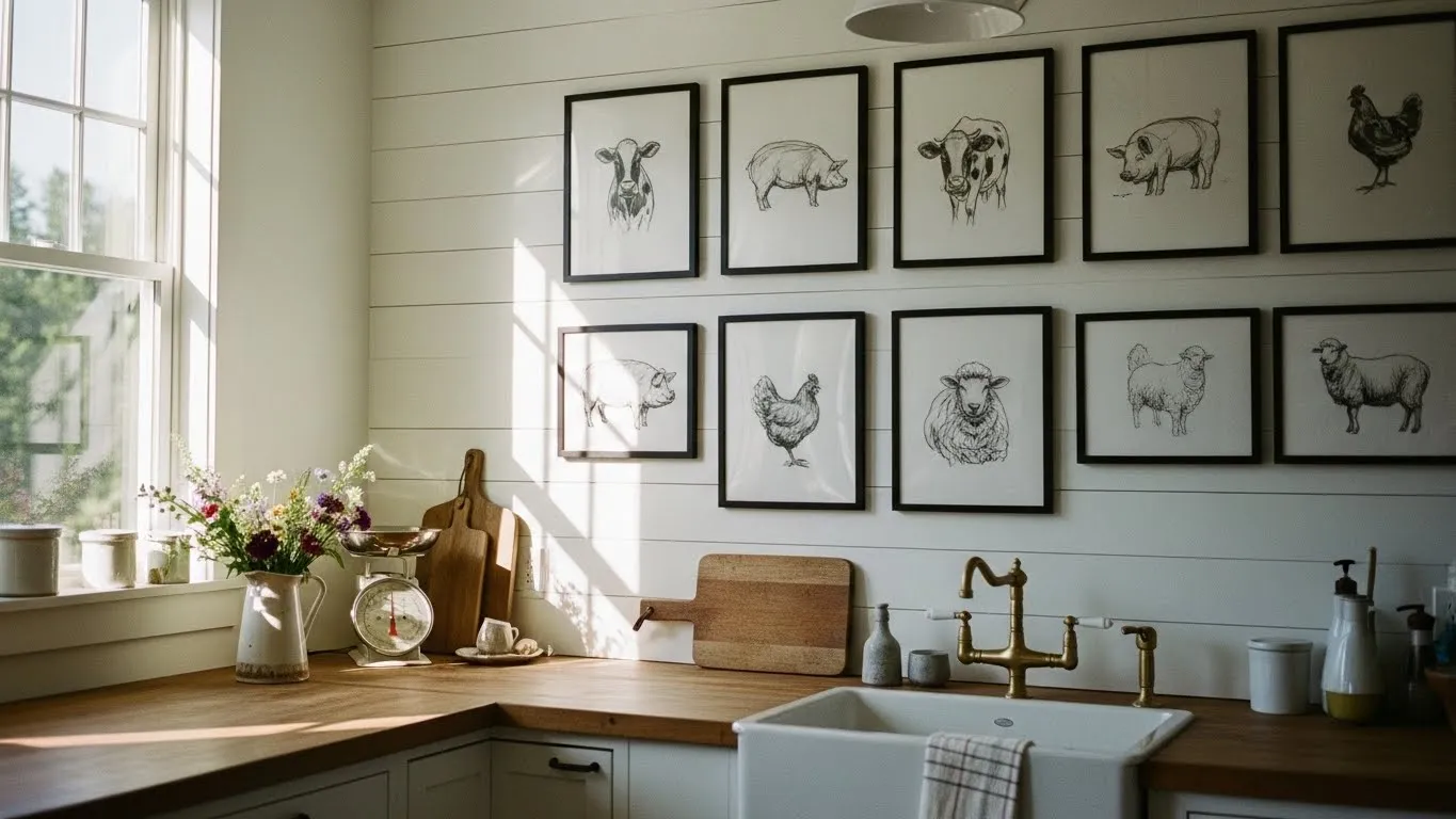 This charming kitchen wall setup features a full gallery of black and white farm animal sketches arranged in the prettiest grid. Each print has its own rustic wooden frame that adds warmth without overwhelming the crisp white cabinets and butcher block counters. The mix of cows, pigs, chickens and barn scenes brings a sweet countryside touch that feels both nostalgic and stylish. With the artwork centered above the farmhouse sink and lit by a simple glass sconce, the whole wall becomes a soft statement piece that pulls the room together.