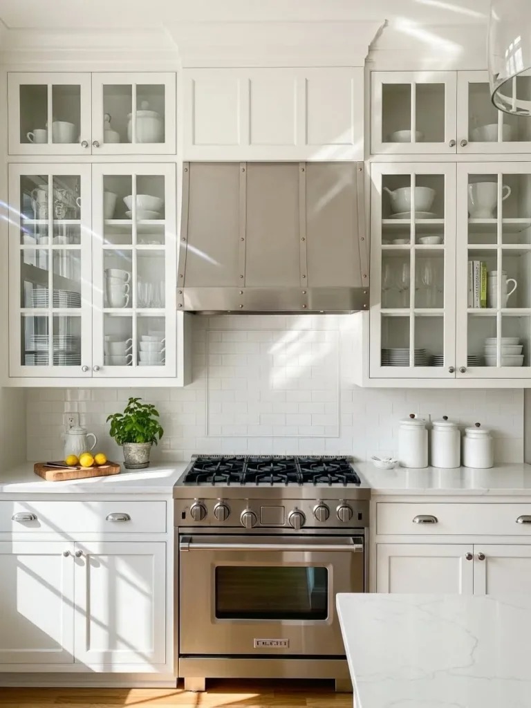 This kitchen has such a fresh and uplifting look with its tall glass front cabinets framing the range like a perfect little spotlight. The crisp white cabinetry keeps everything feeling clean while the glass doors show off neatly stacked dishes that add personality without clutter. The stainless steel range and custom hood bring in that subtle touch of polish that keeps the whole space feeling elevated. Soft sunlight bouncing off the countertops makes the room feel warm and welcoming even with its simple palette.