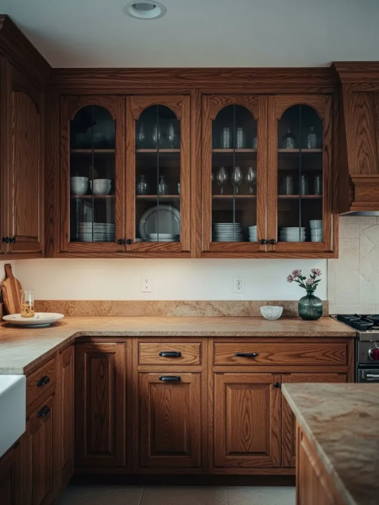 This kitchen brings a cozy and timeless feel with its warm wood cabinetry and beautiful arched glass front doors. The rich grain of the wood adds natural texture while the glass panels give the upper cabinets an open and airy look. Inside, neatly arranged dishes and glassware peek through just enough to make the space feel lived in yet thoughtfully styled. The soft stone countertops and simple backsplash keep everything grounded and let the cabinetry shine as the real star.