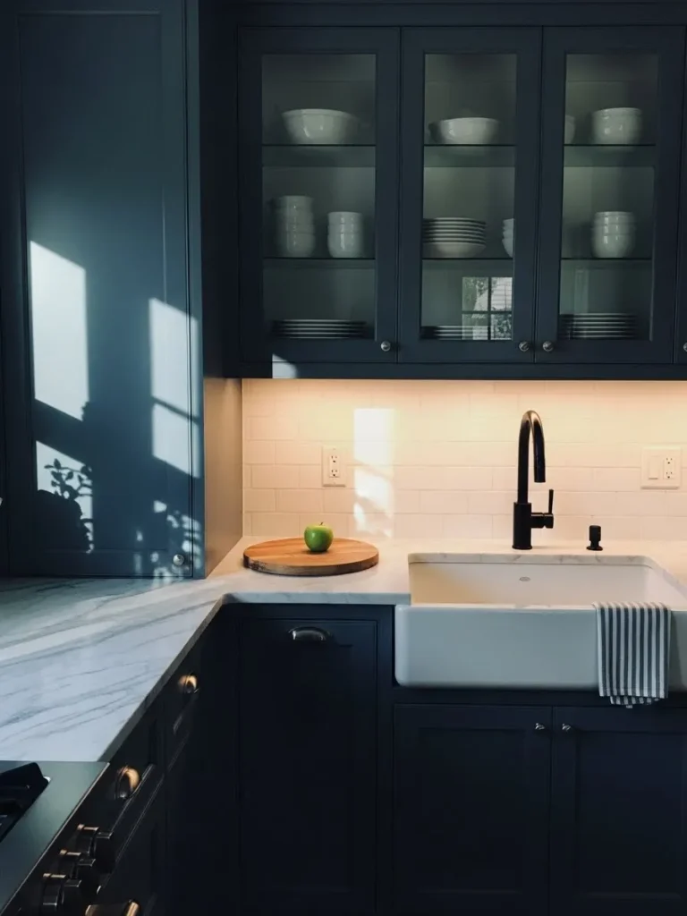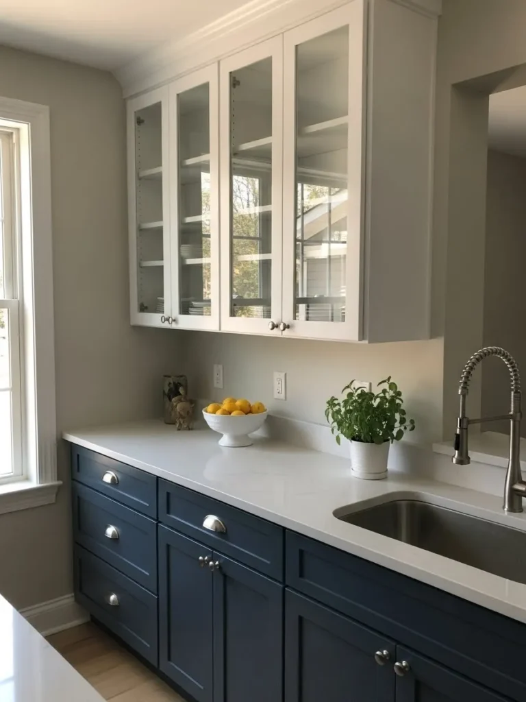 This kitchen has such a bright and uplifting feel thanks to its airy glass front upper cabinets paired with deep navy lower drawers. The glass doors instantly make the space feel more open while showing off those neatly stacked dishes like a little curated display. The crisp white countertops keep everything looking clean and uncluttered, and the chrome hardware adds that subtle sparkle that always makes a kitchen feel more polished. I also love how the sunlight pours in through the nearby window and bounces softly off the glossy surfaces. It all feels simple yet so thoughtfully pulled together.