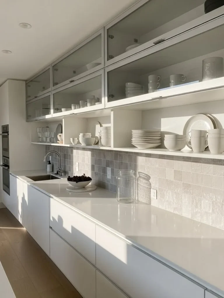This kitchen creates the prettiest blend of calm minimalism and soft modern style. The upper cabinets feature clean glass fronts that show off a curated collection of white everyday dishes. The sunlight pouring across the long countertop makes the whole space feel warm and airy. I love how the open shelves sit below the glass cabinets because it adds such an easy balance of structure and softness. The pale tile backsplash brings in a gentle texture that keeps everything from feeling too stark while the smooth cabinetry and simple hardware keep the look wonderfully streamlined.