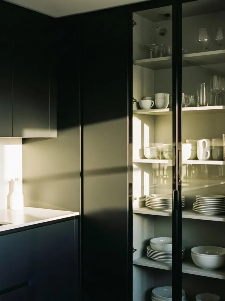 I find this style so beautiful because it balances practicality with a little bit of mystery. The dark cabinetry feels chic and bold, while the glass lets the light bounce around in the loveliest way. There is something so calming about seeing everything organized behind those tall doors and it totally inspires me to keep my own kitchen shelves tidy. It is understated, stylish, and such a mood in the best possible way.