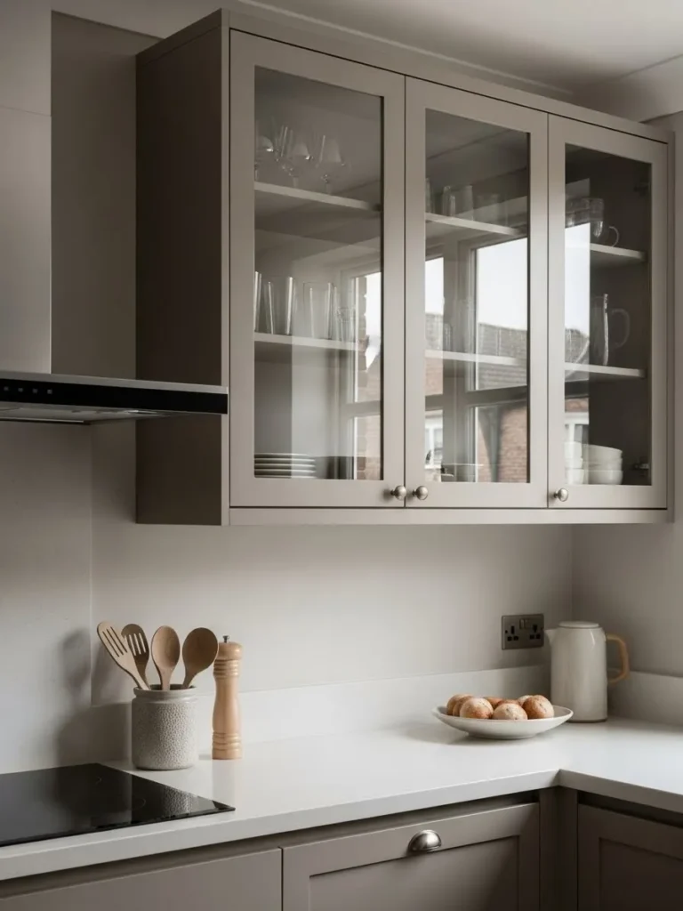 Soft Taupe Glass Cabinets With a Calm and Cozy Feel