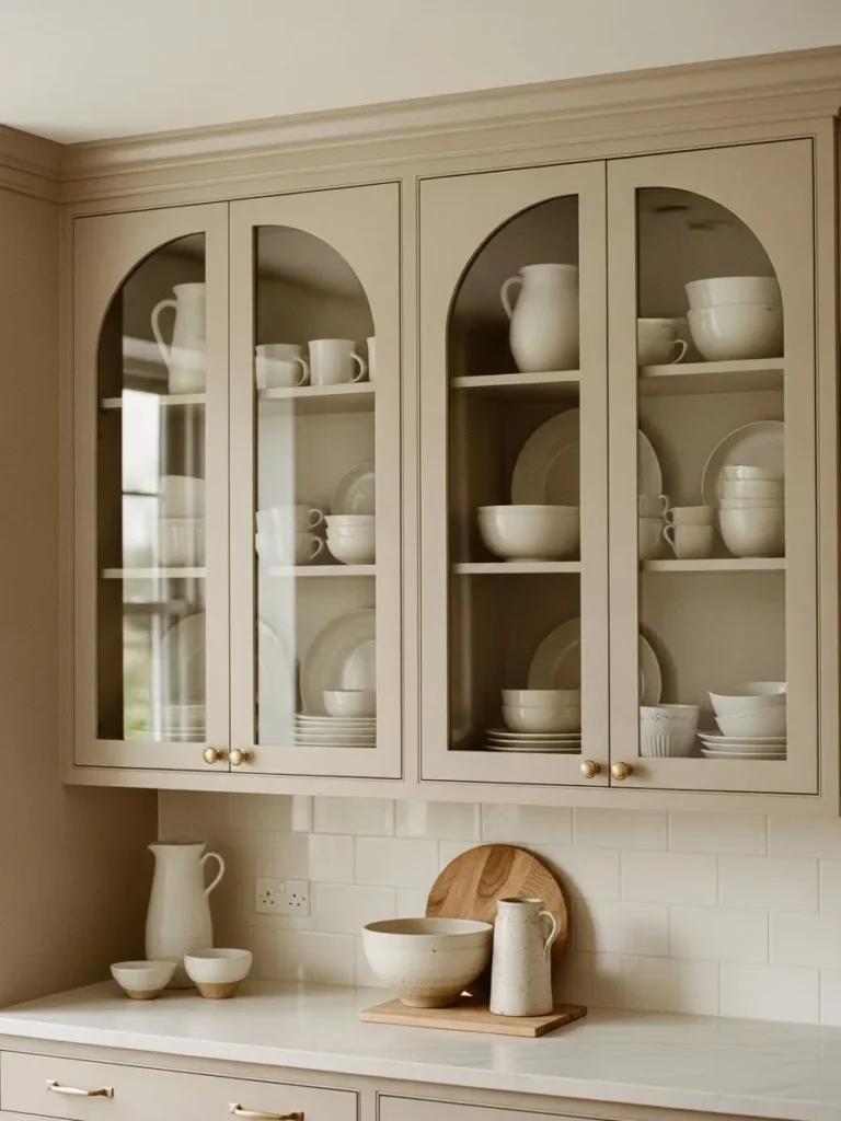 Soft Neutral Cabinetry With Elegant Arched Glass Doors