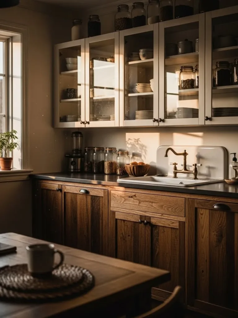 I adore this design because it feels so inviting. The wood brings this gentle warmth that reminds me of slow mornings and peaceful afternoons. The glass fronts add just the right touch of refinement without trying too hard. I could easily see myself rearranging those bowls for fun and feeling a little thrill every time the sunlight hits the shelves just right. It is the kind of kitchen that makes everyday moments feel a bit more special.