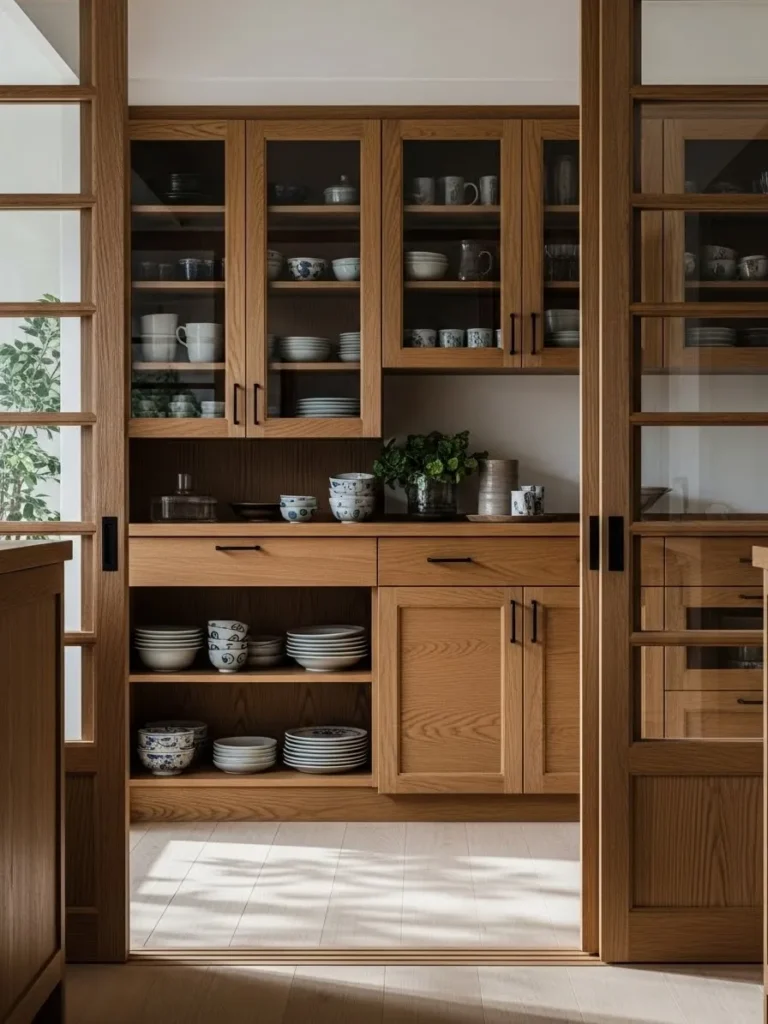 This kitchen feels like a quiet little sanctuary where warm wood tones and soft filtered light make everything look calm and beautifully intentional. The glass front cabinets show off a lovely collection of ceramics and everyday dishes that feel both practical and pretty. I love how the framing creates a sense of structure without ever feeling heavy. The open shelving below keeps the space grounded and easy to use while the glass panels above let the eye travel upward for a clean and airy look. Every line feels simple and elegant which makes the whole room feel wonderfully balanced.