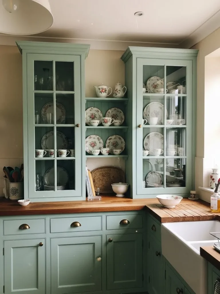 This kitchen feels like a sweet breath of countryside calm with its soft sage green cabinetry and lovely glass front uppers showing off a collection of floral dishes. The warm wood countertops add a cozy contrast to the cool green tone, and the tall cabinets give the whole space a gentle sense of height and charm. I love how the glass doors frame the pretty china like little works of art and how the farmhouse sink ties everything together with that classic lived in feel. The whole setup creates a space that feels treasured and welcoming.