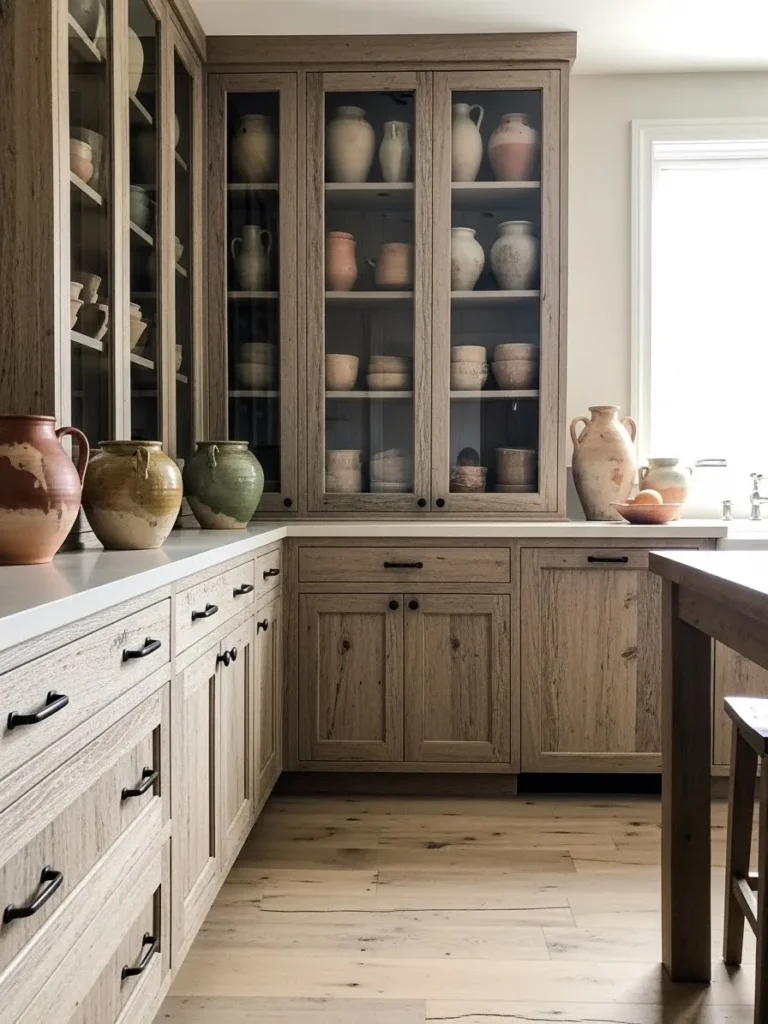 I adore how this design celebrates simple beauty in such an effortless way. The glass fronts let all those pottery pieces shine, and it creates a space that feels collected and meaningful rather than styled for perfection. It reminds me of that dreamy mix of rustic comfort and refined simplicity that so many of us love. Every time I look at it, I can almost imagine wandering in with a cup of coffee and feeling instantly at home.