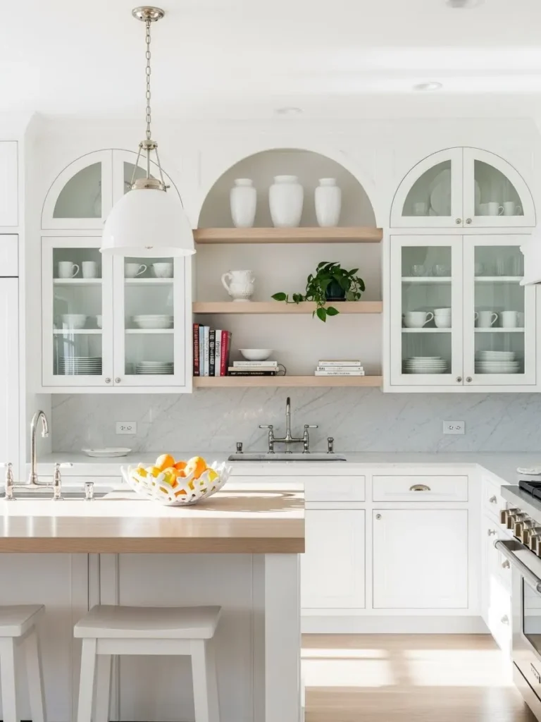 This kitchen uses glass front cabinets to create a bright and graceful look that feels both classic and fresh. The arched cabinet frames add a soft architectural detail while the glass doors keep everything feeling open and breezy. Paired with warm wood shelving and simple white ceramics, the whole space feels curated without trying too hard. The light filled palette, marble backsplash, and clean hardware choices make the room feel calm and inviting. It is the kind of design that blends tradition with a gentle modern polish in the prettiest way.