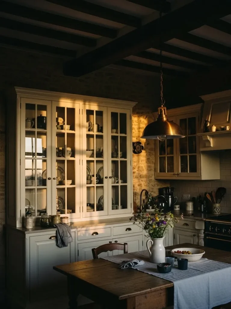 This cozy kitchen feels like the heart of a storybook cottage with its soft evening light washing over classic glass front cabinets. The creamy painted cabinetry pairs beautifully with the warm stone walls, and those glass doors make every plate and teacup feel collected and cherished. The dark beams overhead add a grounding touch while the vintage style pendant light gives the whole space a little glow that feels almost magical. It is the kind of kitchen where you instantly want to sit down, sip something warm, and just enjoy the hush of a slow afternoon.