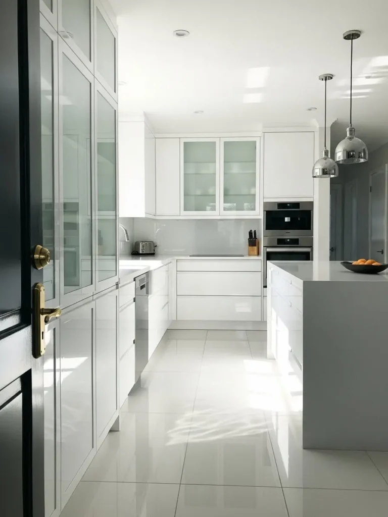 Sleek White Kitchen with Frosted Glass Cabinet Charm