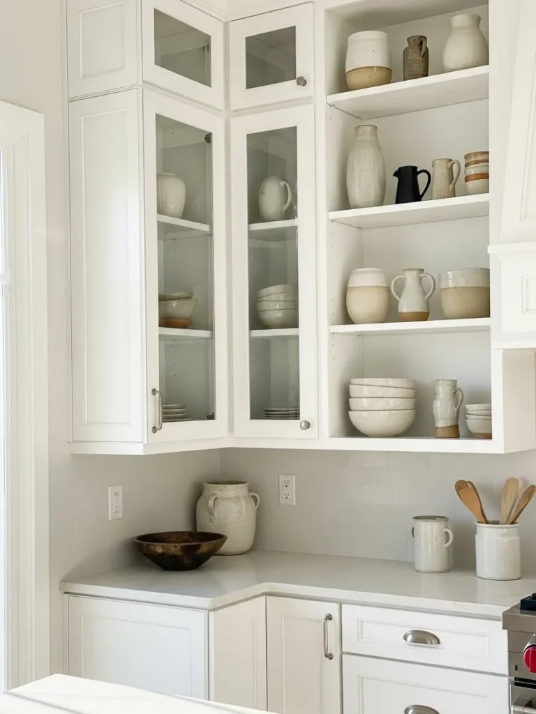 This kitchen showcases glass front cabinets that feel bright and beautifully curated. The tall upper cabinets with clear panes show off simple ceramic pieces that add texture without overwhelming the space. Soft white cabinetry keeps everything looking light while the open shelving beside the glass doors brings in a relaxed collected look. Each piece on display feels intentional which gives the whole corner a calm warm personality that still looks fresh.