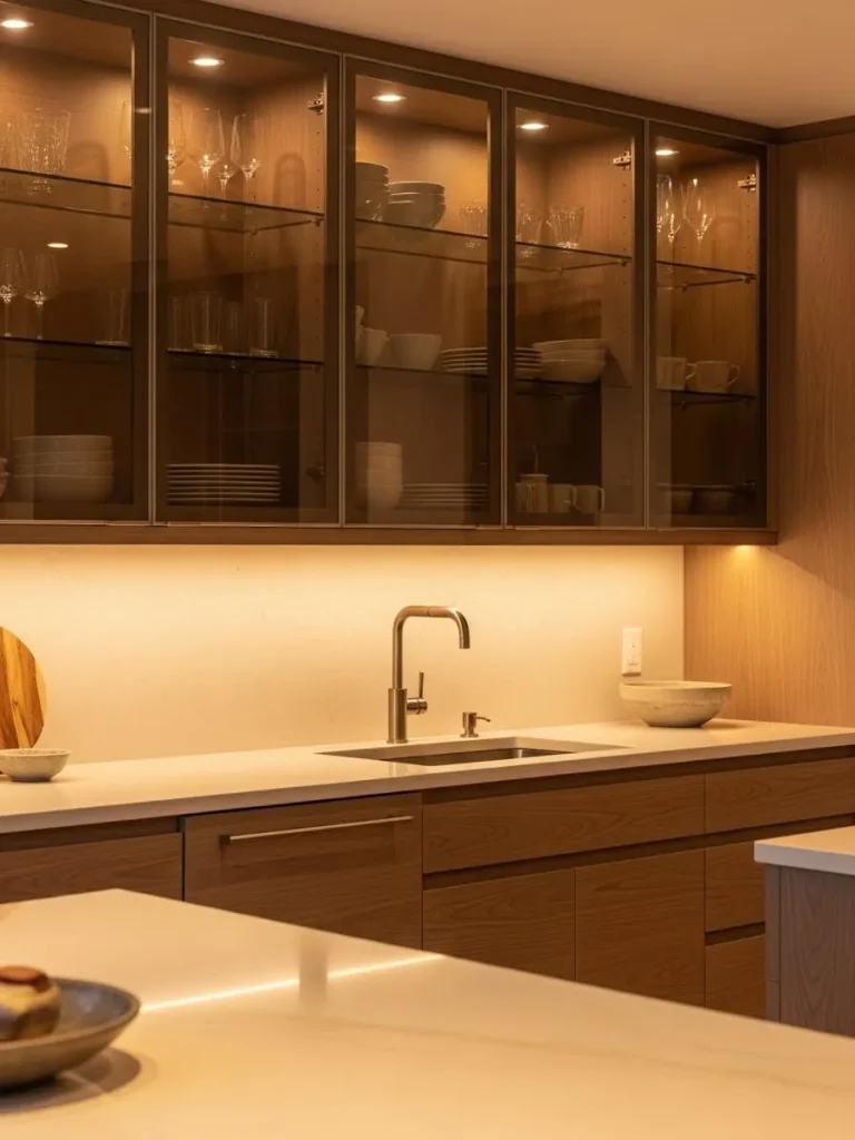This kitchen design brings together warm wood cabinetry and soft illuminated glass fronts that feel both modern and inviting. The upper cabinets showcase neatly arranged dishes and glassware behind lightly tinted panels that catch the light in the prettiest way. Under cabinet lighting adds a gentle glow across the counters and highlights the clean lines of the quartz surfaces. The brushed metal faucet and minimal hardware keep everything feeling sleek while the overall color palette stays warm and calming.