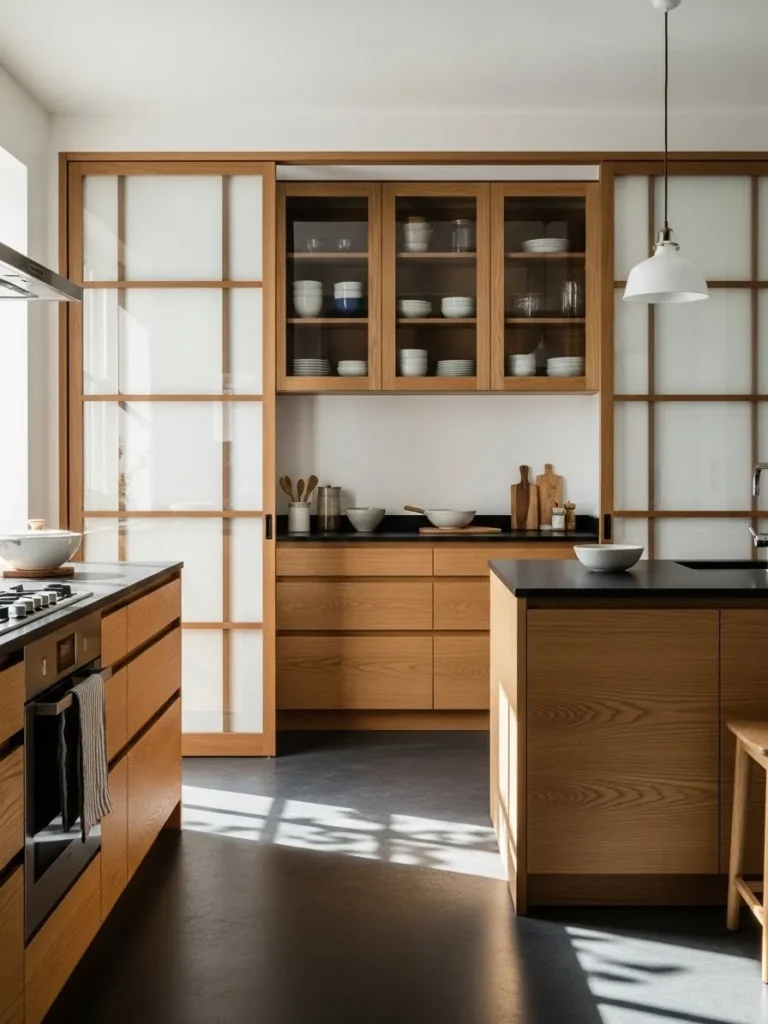 This kitchen blends clean modern lines with the soft warmth of natural wood, creating a space that feels both inviting and effortlessly polished. The glass front cabinets add a beautiful sense of lightness and help the room feel open without sacrificing storage. I love how the frosted sliding panels frame the space and create a subtle Japanese inspired touch that feels calming and intentional. The simple shelving inside the glass cabinets keeps everything looking tidy and curated, while the black countertops add just enough contrast to keep the whole look grounded.