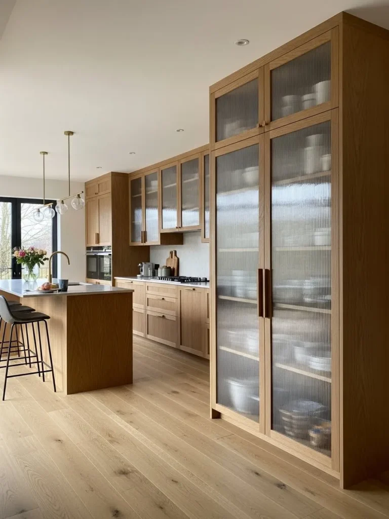 Warm Oak Kitchen With Soft Ribbed Glass Cabinets