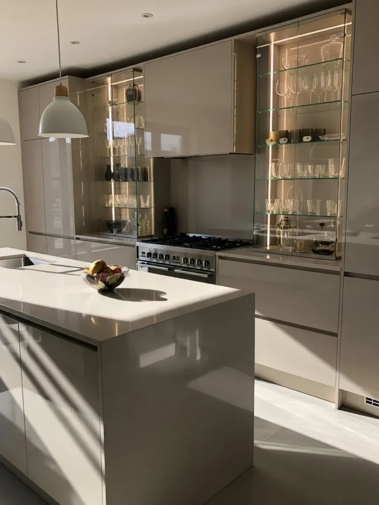 This kitchen feels like a little moment of luxury every time the sunlight pours in through those tall glass cabinet doors. The glossy cabinetry keeps everything smooth and streamlined while the glass fronts add sparkle and personality. I love how the illuminated shelves show off crystal glasses and pretty serveware like they are pieces of art. The island keeps the space grounded with its clean lines and soft sheen while the stainless range adds a touch of professional charm. It is modern and minimal yet still warm thanks to all that natural light washing across the room.