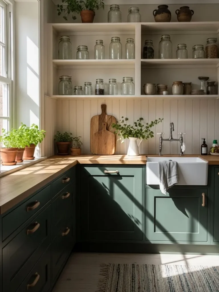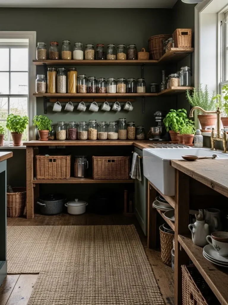 I love how this space blends beauty with practicality. There is something so satisfying about seeing jars lined up in neat rows and knowing exactly where everything lives. The green walls keep the look soothing while the warm wood gives the kitchen that lived in charm I can never resist. It feels like the kind of place where you could make a cup of tea and potter around for an hour without even realizing it.